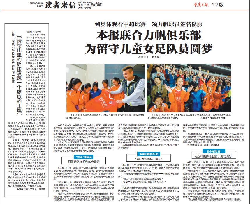 在本报牵线搭桥下,留守女足队员走上了梦寐以求的圆梦之旅:她们第一次来到主城,她们现场观摩了一场高水平的中超比赛,她们还获得了足球明星的亲笔签名……