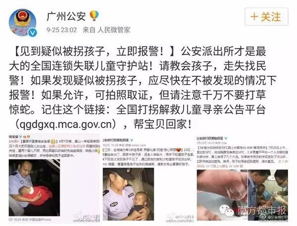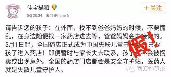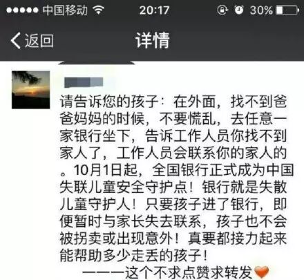 “告诉您的孩子:找不到爸爸妈妈的时候,不要慌乱,冷静的在身边找XXX店进去等,家长会来接你的。X月X日(一般是1日!)起,XXX正式成为中国失联儿童守护站!只要孩子进了XXX!即便暂时与家长失去联系,TA也不会被拐卖或出现意外,XXX店都会是安全守护站,服务人员就是守护人。”