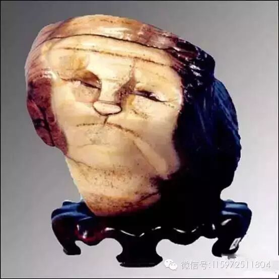 这块奇石神似一位老妇人头像,鼻子、嘴巴、额头上的皱纹、头发宛如真人,尤其是老妇脸上的皱纹都依稀可见。该奇石发现于两亿年前的火山喷发地区,经岁月沧桑,由三色玛瑙形成面容,黑色玛瑙形成五官,慈善安详与现代老妪形象巧合天成。