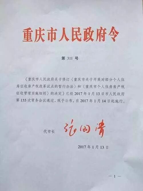 1月13日,重庆市政府下发市长令,修订原来的房产税征收条例。重庆财税部门说,针对近期重庆主城房地产市场出现的异常现象,遏制“炒房”牟利行为,从2017年1月14日起,将原来执行的对无户籍、无企业、无工作的个人新购第二套及以上的普通住房征收房产税,调整为在重庆没有这三个条件的外地人,新购首套及以上的普通住房征收房产税。