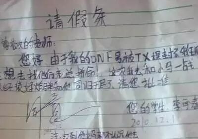 请假条:尊敬的老师,您好,由于我的DNF号被TX误封了,我现在想去找他们老总拼命!这次我去和小马一战,已经装好炸弹和他同归于尽了,请您批准。注:打到他妈都不认识他去