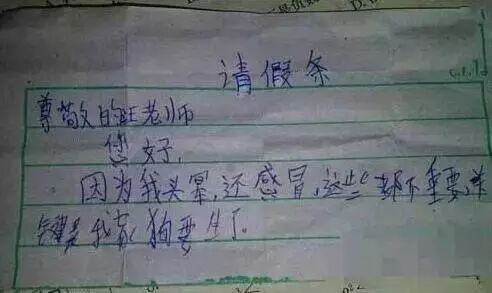 请假条:尊敬的王老师,您好,因为我头晕(字都写错了),这些都不重要,关键是我家狗要生了。