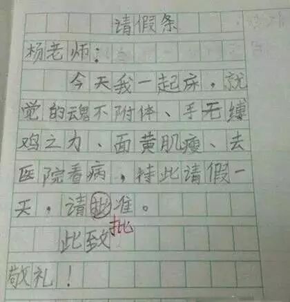 请假条:杨老师,今天我一起床,就觉得魂不附体、手无缚鸡之力、面黄肌瘦、去医院看病,特此请假一天,请批准。