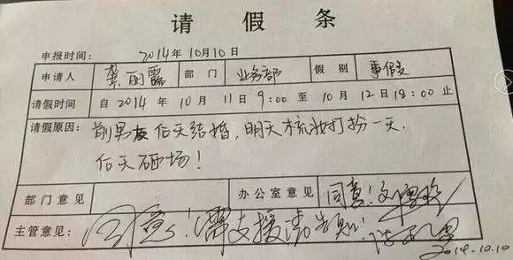 请假条:前男友后天结婚,明天梳妆打扮一天,后天砸场!