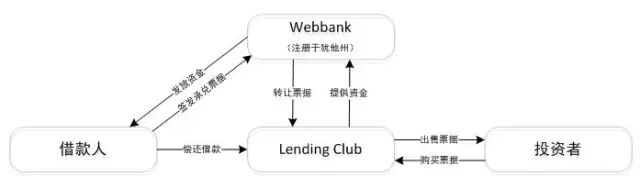 Lending Club的债权转让模式需要第三方银行的介入,借款人向银行签发承兑票据,银行将其转让给平台,平台向银行提供借款资金,然后平台再向投资者出售被定性为有价证券的票据,在借款人归还借款之后向投资者支付收益。