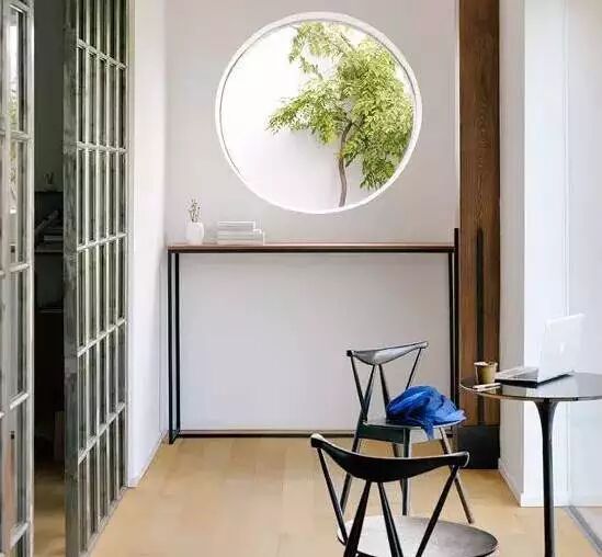 ▼走廊的部分本身光线不好,因此他们引入了江南园林式的圆窗和绿植,反倒成就了一番别样的小心思。