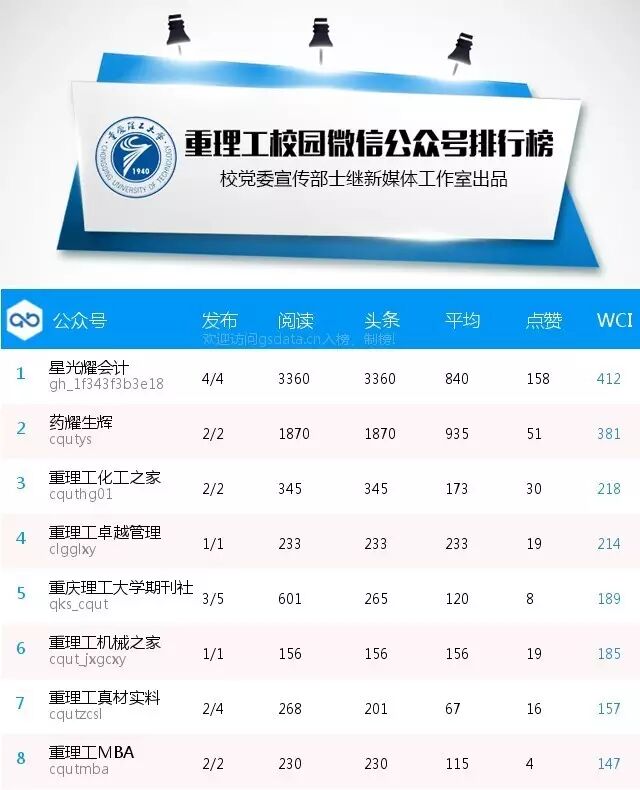 本学期最后一次榜单,总体呈上升趋势。其中星光耀会计依旧排在榜首,WCI更是大幅上涨,突破400。药耀生辉从上周的第七位来到第二位,阅读量上涨一千多,值得鼓励。重理工化工之家、重庆理工大学期刊社各项数据也有所上涨。临近期末,各路小编们也要抓紧时间复习啦,小理祝大家“考的都会、蒙的全对”我们下学期再见吧。