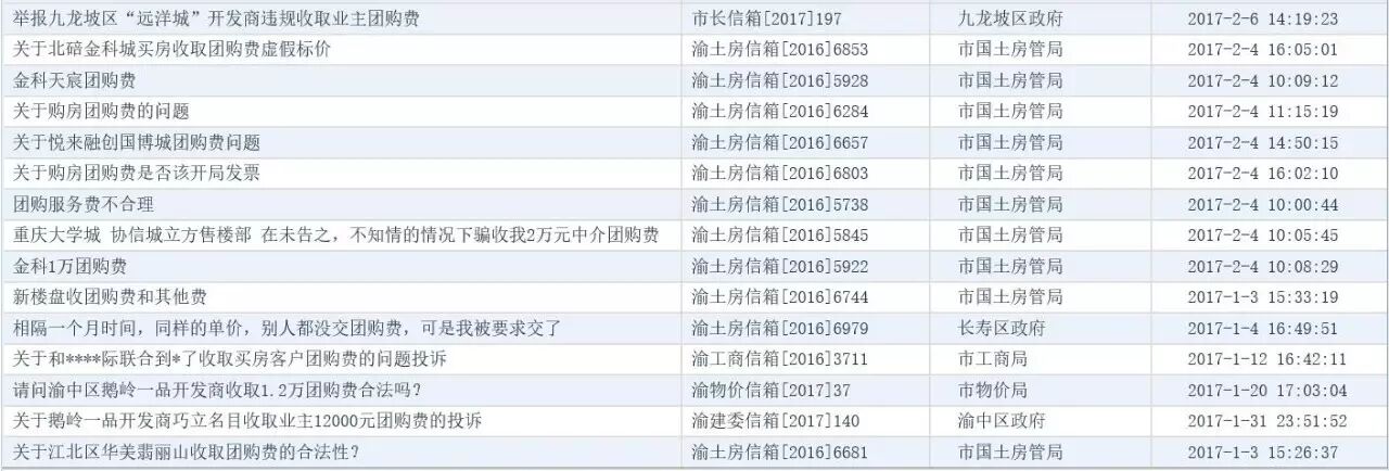 重庆市政府公开信箱中,仅今年以来,涉及购房者投诉开发商或中介收取团购费的就达数十起: