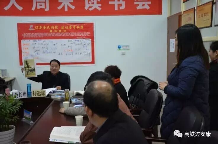 高铁过安康讯(唐纪创)2月25日上午,在安康市图书馆二楼会议室,安康人周末读书会最后一次阅读《安康导游词》。陕西省图书馆地方文献部副主任刘英,随手推门查看了书友们读书活动。她看后高兴地说:“每位读者在读书时不停作笔记,发掘书中重点。讲授的老师准备充分,手拿图片演示,让书友观看了解当时三线建设风貌。真是给读者准备了一顿精神大餐!”