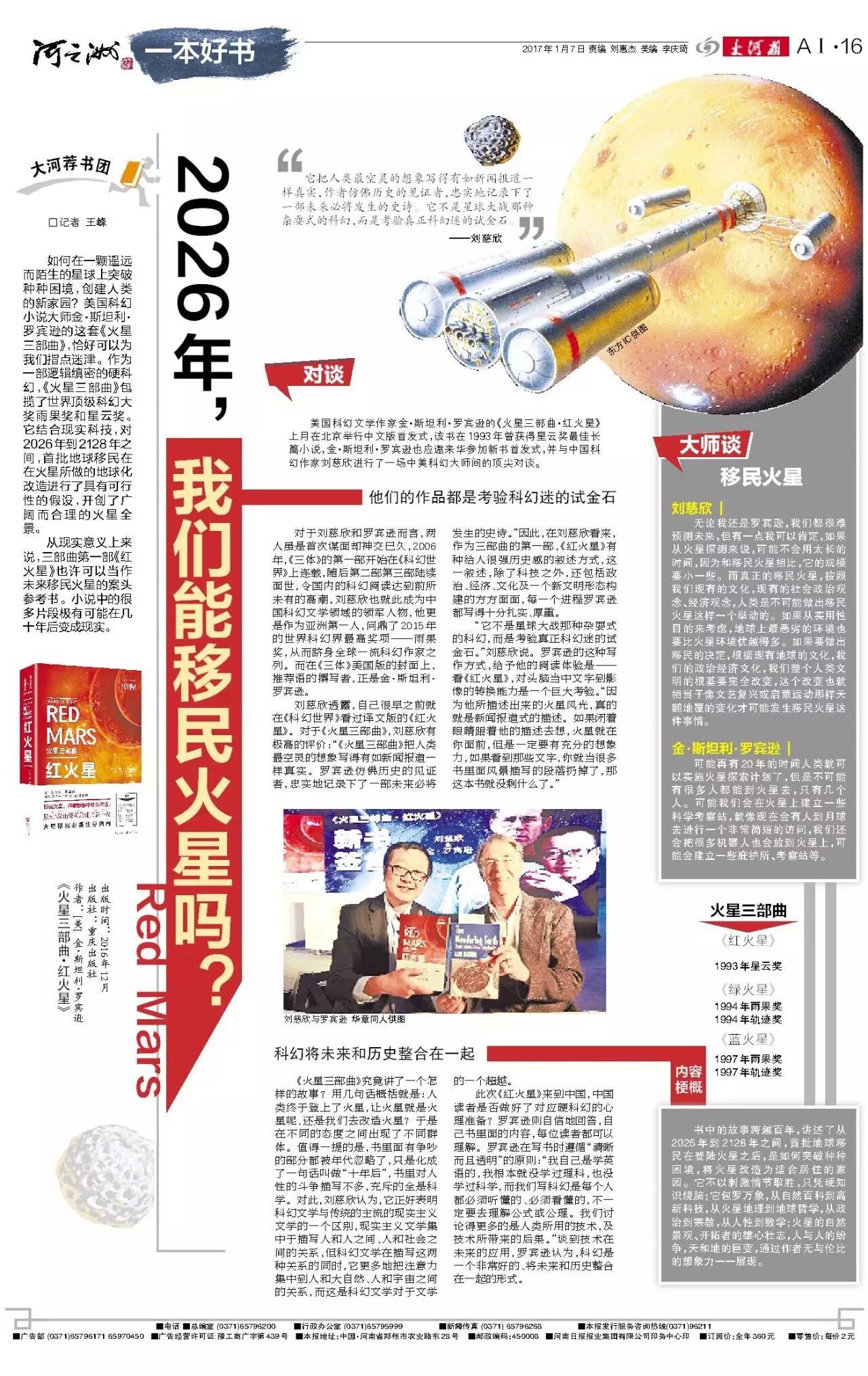 美国科幻文学作家金·斯坦利·罗宾逊的《火星三部曲·红火星》上月在北京举行中文版首发式,该书在1993年曾获得星云奖最佳长篇小说,金·斯坦利·罗宾逊也应邀来华参加新书首发式,并与科幻作家刘慈欣进行了一场科幻大师间的顶尖对谈。