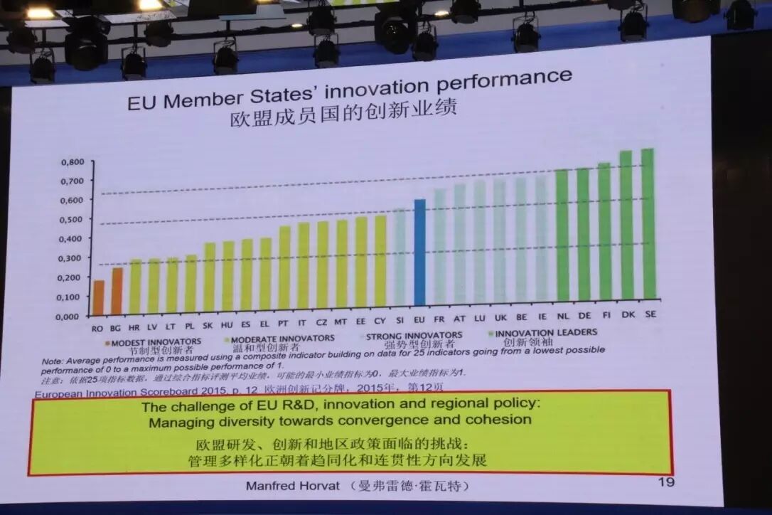曼弗雷德·霍瓦特提到了欧盟创新型联盟记分牌(Scoreboard),欧盟创新型联盟记分牌共由25项创新指标组成,包括驱动力、企业行为、成果三方面来评判。以下是欧盟成员国2015年的创新业绩: