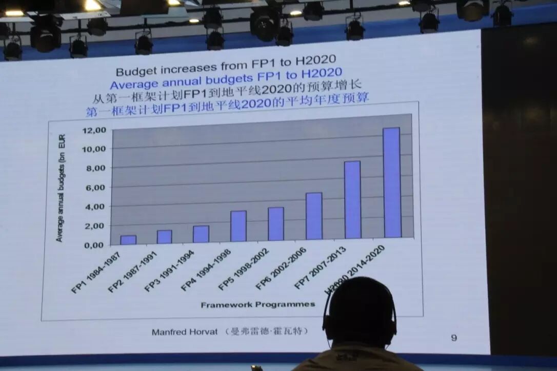 在演讲中,根据曼弗雷德·霍瓦特的演讲,可以清晰的看到欧盟的创新政策从萌发到发展过程,包括欧盟RTD框架计划、里斯本战略、地平线2020等内容。从下图可以看出,从第一框架计划到地平线2020的预算没有因为其他因素而减少。