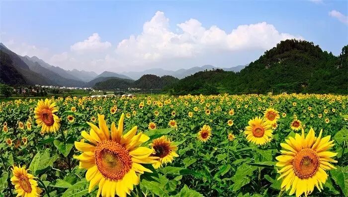 大木花谷:每年夏天,在青山绿水环绕的山谷里,都开满了漫山遍野的向日葵,浓烈繁华,绚丽多彩。从7月下旬至8月中旬,数百万朵葵花将在花谷里竞相开放,面积和数量是以往的数倍。在一米高的向日葵下,搭配了大面积的鼠尾草。金黄色的向日葵与蓝紫色的鼠尾草肆意地开放,交织成一片花的海洋,漫向山谷的尽头,惊艳整个夏日。