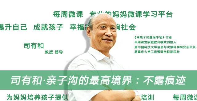 沟通不露痕迹的理念,是司有和教授在30多年来,长期跟踪中国科技大学少年班学生、研究少年班学生成长的经历中发现的。所谓“不露痕迹”,就是指家长在和孩子沟通的时候,不要暴露家长的家庭教育意图,不要让孩子看出来、感觉到,你是在教育他。