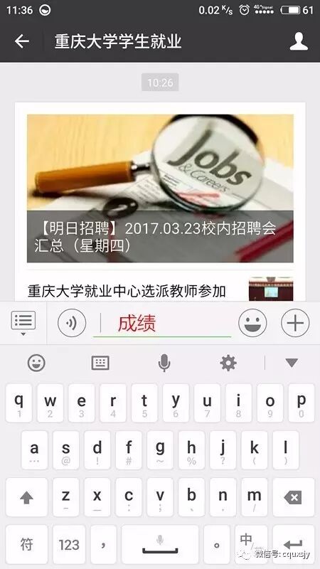 —>—>—>—>—>关注重庆大学学生就业官方微信回复关键字“成绩”即可获得考试成绩快快点击回复吧!