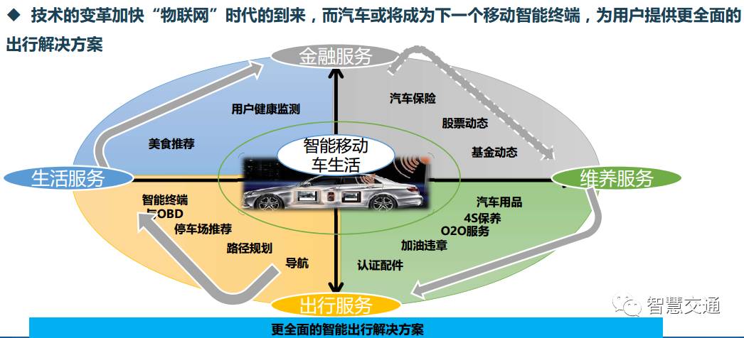 移动互联网催生产品智能化发展。早上起床,饮水加热、窗帘调光、日程管理、新闻资讯的获取等都要求智能化产品;离开家后智能机器人自动打扫卫生;进入休息时智能床自动打开。移动互联背景下,智能家具应运而生,为用户带来更舒适、更智能的生活居家环境。此外,消费电子在人类的衣食住行当中起很重要的作用,随着移动互联的加快,手机已从最开始的纯通讯工具逐渐演变为连接用户衣、食、住、行、玩等一体化生活的移动智能终端。联网汽车就是一个非常典型的例子。汽车将成为下一个移动智能终端,为用户提供更全面的出行解决方案。与移动智能车生活相关的服务主要有金融服务、维养服务、出行服务、生活服务。包括汽车保险、汽车用品、导航、停车场规划、用户健康监测等。