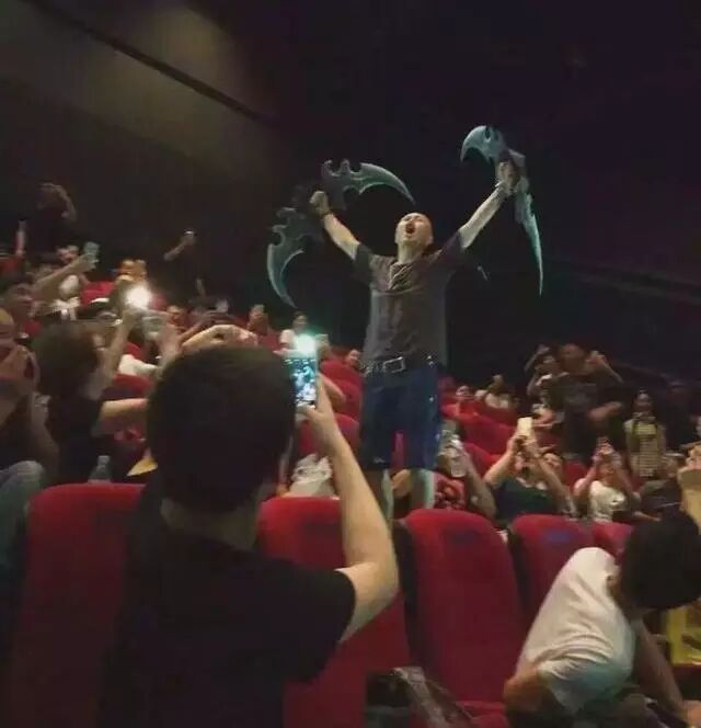 在电影院的某一角落,某一男子COS成了英雄联盟中的英雄——盖伦,并高声呼喊着“德玛西亚”,
