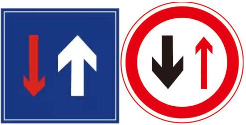会车先行:表示车辆会车时,有条件避让的车要让无条件避让的车先行通过。此时,红色箭头行驶方向的车辆要停车让行,白色行驶箭头方向车辆要先行。