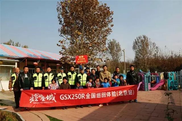 赛场硝烟刚刚散去,11月6日GSX250R车队又开启了公益之旅。车队来到位于北京顺义区的“太阳村”,。这里的孩子与一般孤儿等相比,更容易受到外界的歧视,有着更深的心灵创伤。大家深知孩子们最需要陪伴,骑手们就陪他们做游戏,豪爵京津冀分公司为“太阳村”捐赠了一棵爱心树,愿它陪伴孩子们茁壮成长。