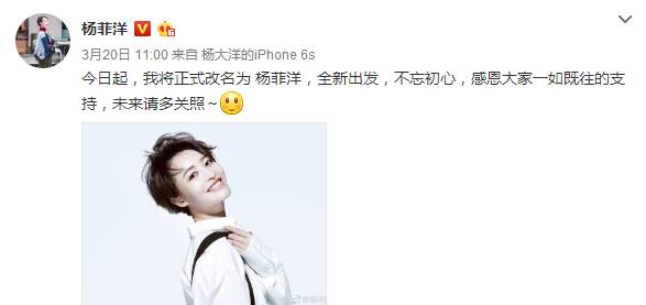 但就在昨日,杨洋在微博宣布改名为杨菲洋,全新出发,不忘初心,感恩大家一如既往的支持。