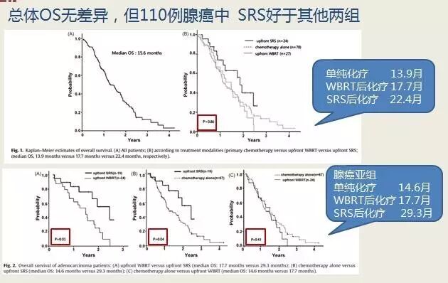 一项研究对比了放疗加化疗与单纯化疗的效果,三组患者分别进行单纯化疗、WBRT后化疗或SRS后化疗,结果显示,三组患者的OS无差异,但是在腺癌中,SRS后化疗的效果优于其他两组。