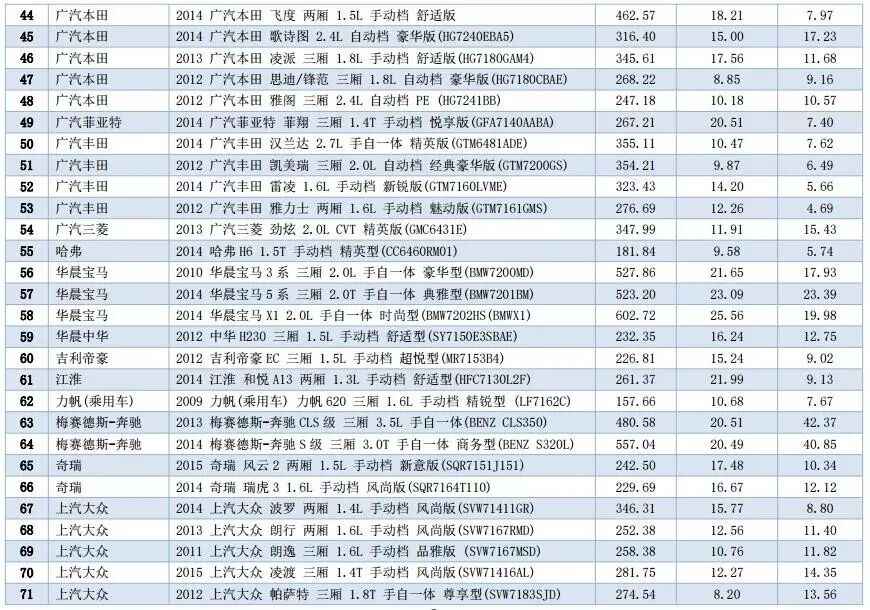 从上面这些表格中,我们可以看到,“2014 北京奔驰 GLK 级 2.0T 手自一体 (BJ6453F4E)”的汽车零整比最高,为861.10。也就是说,若该车型全部换零配件,费用可以买到该车型8辆多新车。
