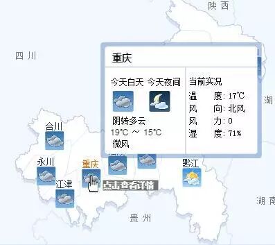 这几天的寒流是不是把各位都冻成狗了,以前都说是冬天才会被冻成狗,这次倒好,秋天就被冻成狗了。但是各位欢呼吧,这周不出意外我们可以过一个温暖的双休日了。 按照天气预报,昨天我市以阴天天气为主,局部地区有零星降雨。据重庆市气象台最新预报,未来三天重回阳光天,全市最高温25℃。 我市有7个区县的最高气温在18℃以上,最暖的地方开县18.8℃。全市最低气温出现在酉阳,为8.6℃。主城区最高气温为18.3℃,最低气温为14.8℃。 据实况监测显示,前日,在重庆大部持续多日的降雨终于停歇。重庆中西部偏南地区及东南部大部地区阴天有小雨,其余地区阴天为主。而刚刚过去的10月下旬,重庆各地均有小到中雨,局地大雨,旬降雨量较往年偏多。 重庆市气象台预计,未来三天重庆各地以阴天到多云的天气为主,坪坝河谷地区早上有雾。由于近日天气转好,各地气温有所回升,大部最高温将回升至25℃,主城区最高温也将回升至22℃。 今天,各地阴天,有短时多云,坪坝河谷地区早上有轻雾。大部地区气温12~22℃,城口及东南部地区9~19℃。主城区:阴天,15~19℃。 明天,各地多云,坪坝河谷地区早上有雾。大部地区气温11~24℃,城口及东南部地区8~22℃。主城区:多云,早上有雾,15~21℃。 后天,各地多云间阴天,坪坝河谷地区早上有轻雾。大部地区气温12~25℃,城口及东南部地区10~23℃。主城区:多云间阴,16~22℃。