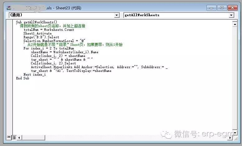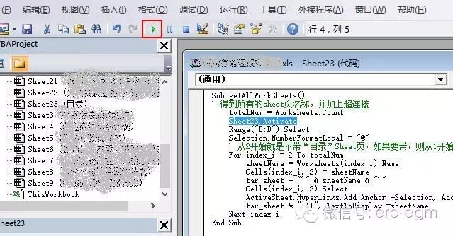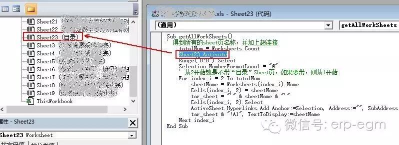 第五步:第四行代码 Sheet1.Activate,要根据左边目录所在sheet的实际数字修改,比如左边的目录所在的Sheet 显示的是sheet23,则要修改成 Sheet23.Activate,见下图: