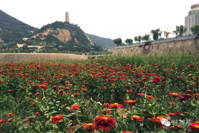 ▼巍巍宝塔山,,延安让人魂牵梦绕。今日的宝塔山下,红艳艳的花儿绽放,人们享受着生活。