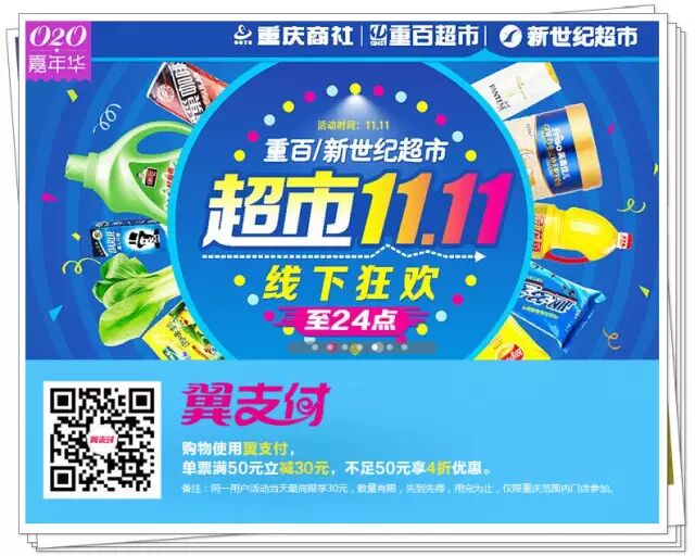 活动方式:线下超市,翼支付(需要提前下载app绑卡)满50-30,不满直接四折