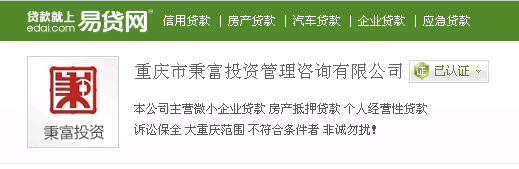 在「易贷网」上,有一份它的介绍,称「与重庆各大银行,知名担保公司以及民间资本合作,为个人经营和企业发展提供银行担保贷款、民间短期融资、资金过桥、股权投资、资产管理、投资咨询管理等信贷融资服务,致力打造一流的企业融资平台。」