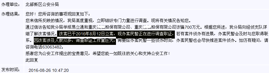 2016年8月26日,两江新区政府信箱[2016]241透露,8月12日,重庆P2P平台「易利通」被立案调查。