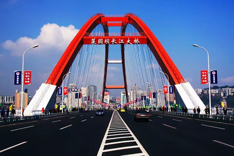 重庆菜园坝长江大桥位于长江上游重庆主城区重庆两路口到南坪之间大江之上,全长1651米,建成于2007年,创下了三项世界第一:钢箱拱梁跨距420米,为世界第一长;是世界第一座公路轻轨两用城市大桥;也是世界第一座采用缆索吊机安装的大桥,成为了重庆交通的一条重要干道和一道美丽的风景线。