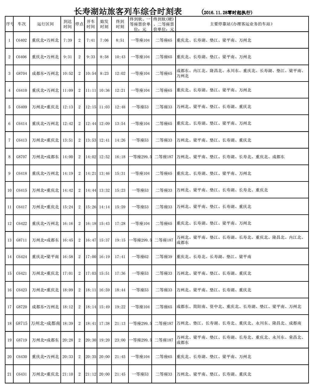 长寿到万州一等座票价115元,二等座票价72元;长寿到重庆一等座票价42元,二等座票价26元。