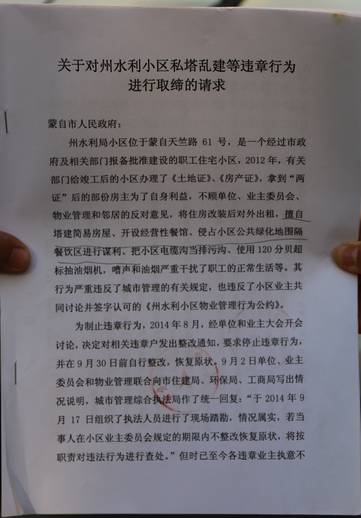 据州水利局小区业主委员会书面反映:部分房主对外出租房屋,租户进行搭建简易房屋、侵占小区公共绿化地围隔餐饮区等行为违反了小区业主共同讨论起草的《州水利局小区物业管理行为公约》,同时也干扰了小区住户的正常生活。