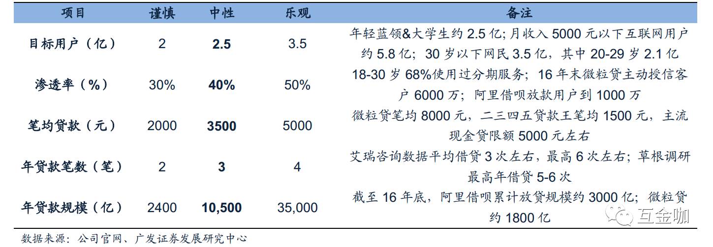 据广发证券从目标用户、渗透率、年借贷次数和平均借款规模角度对微观消费金融规模进行测算结果表明,中性假设下仅万元以下(主要为5000元以下)互联网现金贷业务,今年的潜在市场规模将达到1.05万亿。考虑相对大额的商品消费贷业务(几万到十多万),行业潜在整体年交易规模或更高。