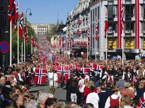 圣马力诺、匈牙利和挪威的国庆多姿多彩,5月17日是挪威的国庆节(又叫宪法日)。在这个盛大的节日里,人们会穿上背带式拖地长裙,红色、白色、黑色、绿色,在厚厚的毛呢、棉布上绣着鲜艳的花朵和图案,每个人的胸前都有漂亮的银制饰物,有的还披着配套的斗篷,带着相同色彩的民族小帽,绚丽多彩地聚集在一起。