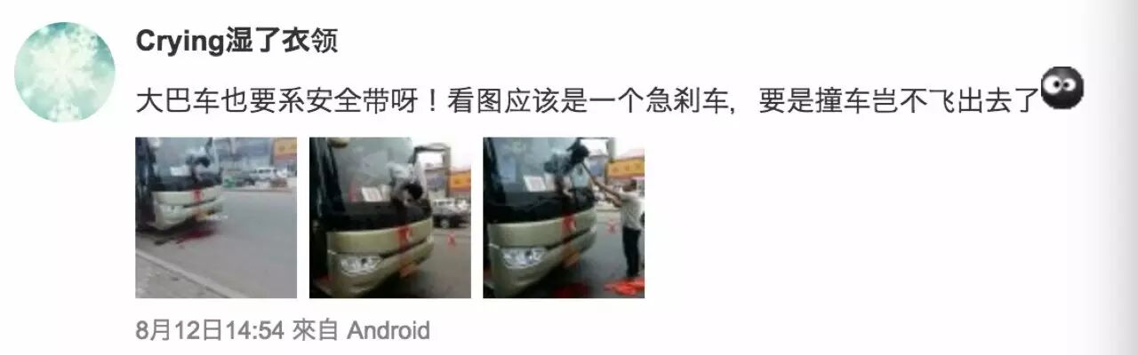 微博上广为流传的一组图片中,一名大巴车乘客因为没系安全带,在车辆急刹车而冲了出去,撞到了前玻璃上。(图片比较血腥,小编就不放全图了)