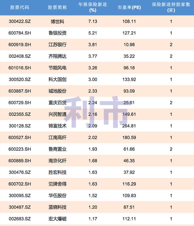 其中,从持股占流通盘比例来看,险资年报新进个股当中,持股比例1%以上个股,共有19家,近期强势股博世科更是高达7.13%;新进个股当中,持续比例2%以上个股,共有11家,分别为博世科、鲁银投资、江苏银行、齐翔腾达、节能风电、科大国创、城地股份、重庆百货、兴民智通、锦富技术、以及江南高纤。其中近期大热门板块次新股,占3家,分别为江苏银行、科大国创、以及城地股份。