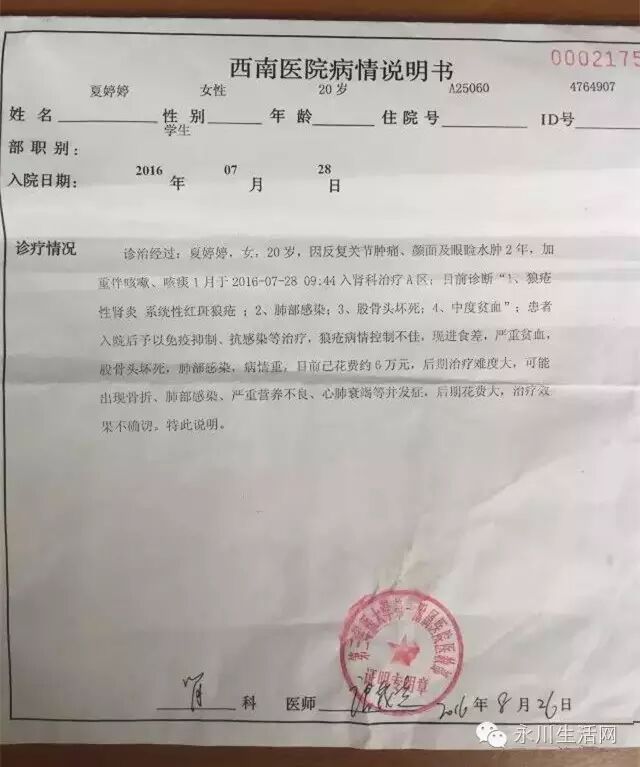 今年夏婷婷同学的病情再次加重,于2016年7月28日再次住进了第三军医大学西南医院,入院后出现进食差,严重贫血,股骨头坏死,肺部感染,第二次住院已花费6万元,前后共计花费12万余元,后期花费更大,但巨额的医疗费已经使她的家庭不堪重负,本就不富裕的家庭早在这两年就为她的病花光了所有的积蓄,使得夏婷婷同学因无法支付医疗费不得不停止用药。