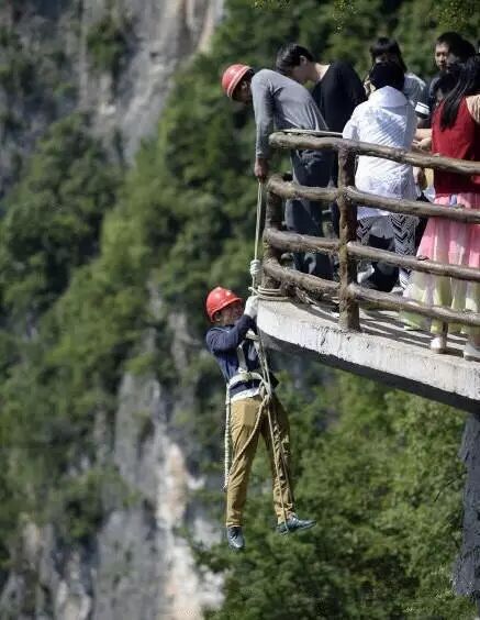 这是工作在重庆龙缸景区悬崖峭壁间的“蜘蛛人”每天工作8小时,工资180元。