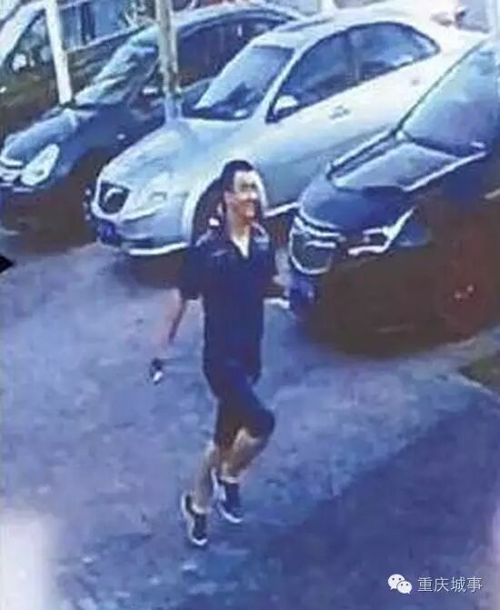 监控录像刚好拍下蓝T恤男子的正面图像。画面中,蓝T恤男子一边跑还一边面露微笑。