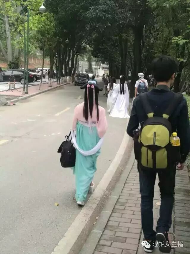 野炊结束,再去拍美照,就沿着蜿蜒的湖堤行走。突然一位身着一袭白裙的古装女子从身边飘过,她头顶的发髻高高的,如那白娘子的造型。我和小妹不约而同用眼睛追随她的后影,不觉间又有一粉色着装的古代女子样的妙龄少女飘然而过,她身后凑拥着七八个中年男子,都拿着摄影器材。小妹加快速度跟了上去,我陪母亲尾随其后。