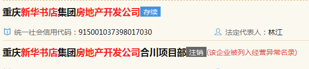 另外 ,小添财在查询过程中发现,重庆新华书店集团房地产开发公司合川项目部已经注销,被列入经营异常名录,注销原因: 强制解散(被撤销)
