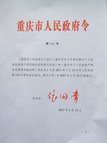 新闻发言人:鉴于此,市政府决定修订2011年施行的《重庆市关于开展对部分个人住房征收房产税改革试点的暂行办法》和《重庆市个人住房房产税征收管理实施细则》(重庆市人民政府令第247号),将“征收对象”中的“在重庆市同时无户籍、无企业、无工作的个人新购的第二套(含第二套)以上的普通住房”调整为“在重庆市同时无户籍、无企业、无工作的个人新购的首套及以上的普通住房”。调整后的个人住房房产税政策以重庆市人民政府令第311号公布,自2017年1月14日起施行。