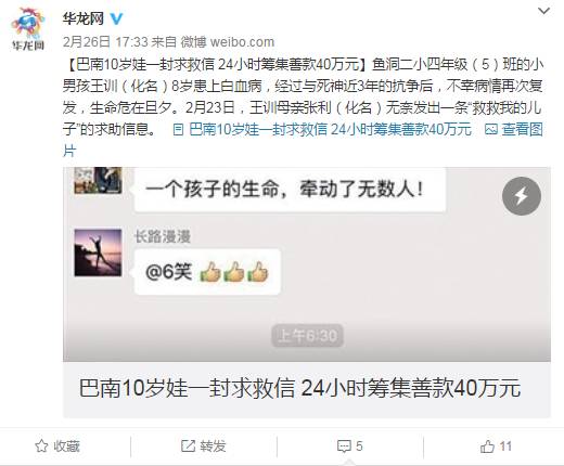 8岁患病他在爱心的温暖下抗病复学张利和丈夫本有一个温暖、幸福的小家庭,可是,2013年3月,一张诊断书如晴天霹雳,瞬间击垮了一切美好的憧憬。当时他们才8岁的儿子王训被查出患急性髓细胞白血病,作为普通职工的他们不知所措,为30万的治疗费用犯愁。2块、10块、50块……一时间,一场爱心行动在鱼洞二小展开,师生们纷纷伸出援助之手,用自己微薄的力量救助这个脆弱的生命。“通过学校募捐,为孩子筹集了7万元救助金。”鱼洞二小校长刘玉霞回忆说,当时,王训的班主任还自行号召班上学生的家长再次捐助了2万元。之后,,最终筹得善款十万元,让这个家庭第一次在社会的帮助下渡过难关。经过张利夫妻俩和学校的努力,王训一年里做了9个疗程的治疗,病情得到很好控制,并返回学校上学。10岁复发父母救子网上发起求助行动医生曾叮嘱,孩子必须每天吃药进行调理,如果3年里病情不复发,那就基本痊愈。从2013年12月至2016年9月还差3个月就是整整3年。可是,命运又和这个艰难的家庭开了“玩笑”,2016年9月,王训病情复发。“当发现孩子病情复发时,所有人都非常痛心。”王训的班主任李琴说,王训这3年受尽病痛的折磨,但他坚强得让人心疼。每到中午时,他自己用开水把药暖热,一手拿着药袋喝药,一手拿着笔写作业,他有时候会微微皱眉,这才让人感知到这个药到底有多苦。“每次班上的积分兑换活动,他却要兑换小夹子送给表姐,班上偶尔发的小零食,他每次都带回家和父母一起分享,非常懂得感恩。”班主任李琴说。然而,乖巧懂事的王训并没有得到命运的“偏爱”,2017年2月23日,医生告诉王训母亲张利,孩子目前是最佳的治疗时期,如果再不进行骨髓移植手术,进一步恶化后将无法挽救。但高额的治疗费用让夫妻俩再次焦头烂额,救子心切,夫妻俩在网上发起一场“救救我儿子”的求助行动。爱不停息24小时筹集40万让生命延续当张利夫妻俩的求助信息转发到四年级(5)班的家长群后,家长和老师纷纷转载。1小时不到,鱼洞二小各个教师群、家长群都出现了这条求助消息,如一个爱的火种被点燃。“我是鱼洞二小校长刘玉霞,我为此次求助的真实性做担保!”“我是鱼洞二小老师李琴,请救救我的孩子 。”“请帮帮这个可怜的孩子。”……师者仁心,当天上午,鱼洞二小教师的朋友圈被这条求助消息刷屏。当天下午,这条消息在巴南人的朋友圈不断蔓延,市民纷纷伸出援手,捐款以每小时超过1万元的速度增长,24小时筹集善款40万元。截至记者截稿时,帮助人次已达到10577次,筹集资金40余万元。目前,巴南区教委已联系区学生资助管理中心、,区工会等相关单位进行救助,并已得到区民政部门关注,且与区低保中心商定,待孩子手术完成后,向该单位提交有关手续申请临时救助。这一切,让张利夫妻俩感激涕零,浓浓的关爱如雪中送炭般温暖着这个家庭,让生命得到了延续。