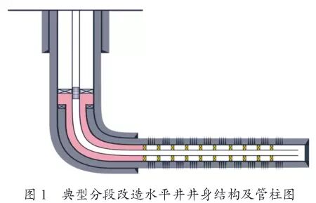 典型分段改造水平井井身结构及管柱如图 1 所示, 首先采用钻杆送入尾管悬挂器和封隔器管串到预定位置, 投球打压一次性坐封悬挂器和所有封隔器, 然后丢手送入钻杆柱、 上提送入钻杆柱, 下入完井管柱至悬挂器顶部棘齿密封并坐挂油管, 最后进行逐段改造后排液、 投产。