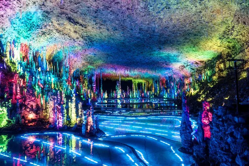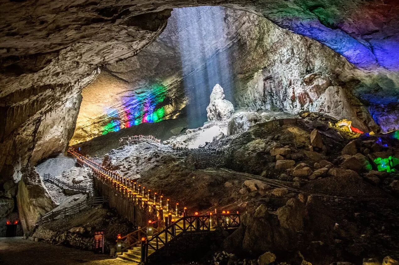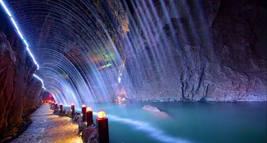 天泉洞内常年气温18℃,是中国天然游览长度最大的溶洞。你看,从那个奇特的天窗里洒下了一股飞泉,泉水在阳光的照射下形如千万颗珍珠玉石从天而泻,那便叫做“泻玉流光”。晴天,看到光柱还伴有彩虹,雨天则是一个环形瀑布从天而降。据说天窗下的那对老夫妻已经在一起了250万年了,都不觉得累,听说那是因为他们善于打开天窗说亮话!