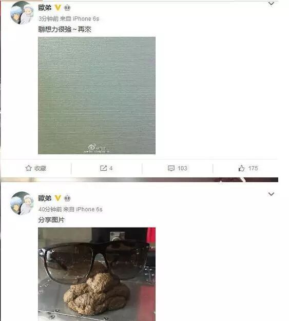 先是欧弟发微博:狗老了,很多人都看腻了疑似被赶走。吓得天天向上节目组马上表示也表示明明是他自己要走。5月18日,全明星探曝光了大张伟与经纪人的恋情,两人疑两年前已低调领证,消息一出就引发网友热议。欧弟立即晒了张韩国女星剧照并发文说:其实我经纪人以前长这样。网友指出他是在拐弯抹角影射大张伟。不久欧弟就删了微博,又发了一张巧克力做成大便的照片,似乎在反击网友。大张伟在18日晚给出回应:我们是仗义救场,不是抢人饭碗 。
