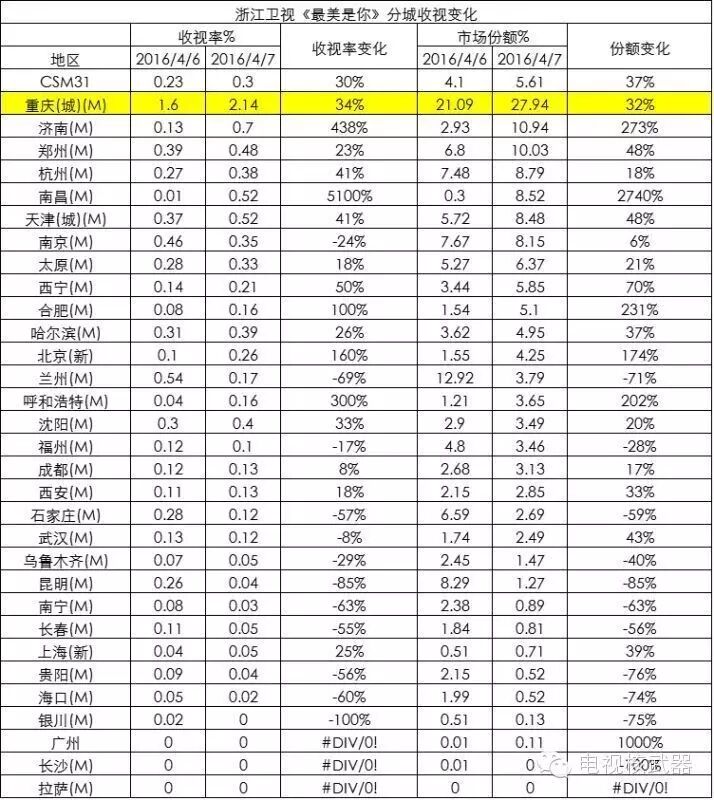 4月7日,浙江卫视白天重播了在东方卫视黄金档首播的电视剧《最美是你》,该剧该天在重庆地区的收视份额竟然达到了逆天的27.94%!在南昌地区的收视率较前一天更是暴涨51倍,且几个城市都出现了收视激增的异常现象。对于此,我们有理由认为这种几个地区的暴增是不正常的。一部优秀的电视剧的收视是随着剧情的发展而逐步变化的,且这种增长应该是全国绝大多数地区,但是从上表中我们看到的只是部分城市的暴涨,正是这几个城市的暴涨拉高了收视。